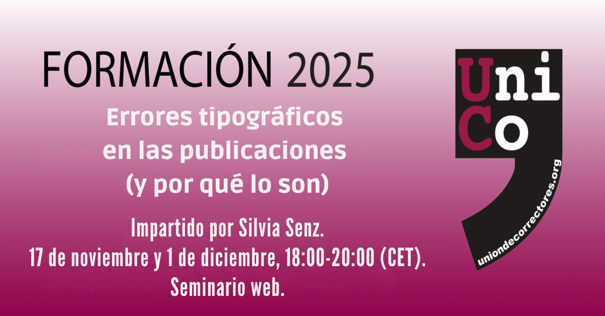 El próximo seminario web de UniCo estará impartido por Silvia Senz Bueno, filóloga hispanista y máster en edición, y se celebrará los días 17 de noviembre y 1 de diciembre de 18:00 a 20:00 (CET). Como siempre, se grabará y estará disponible durante un mes para las personas inscritas que no hayan podido asistir en directo o que deseen repasar los contenidos.